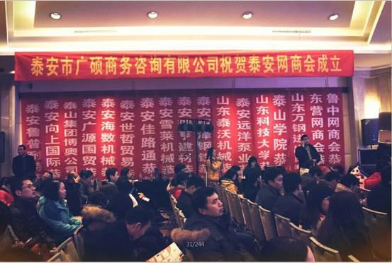 2015年1月26日,泰安市網(wǎng)商協(xié)會成立大會在泰安寶龍福朋酒店隆重舉行。參會的有泰安市政府領導、泰山區(qū)區(qū)委書記和阿里巴巴北方區(qū)域、泰安市商務局、泰山區(qū)商務局、市建行、泰山學院、山東科技大學、市外網(wǎng)商會等多家單位的主要領導以及泰安網(wǎng)商會全體會員。